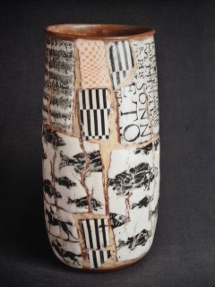 Einer seiner gestalterischen Wege liegt in der Verbindung graphischer Elemente mit den keramischen Objekten. So hat Möhwald eine Umdrucktechnik entwickelt, die es ihm erlaubt, Gedrucktes – Bilder, Muster, Schriftzeichen, Typographien – auf den Ton und unter die Glasur zu bringen. Dabei ist er graphisch-malerisch unterwegs. Seine Vasen und Teller erzählen stumme Geschichten – es sind darauf Bildspuren, meist Fragmente nur, die die zu lesen sind, auf Wege führen, der Erinnerung und Assoziation.
