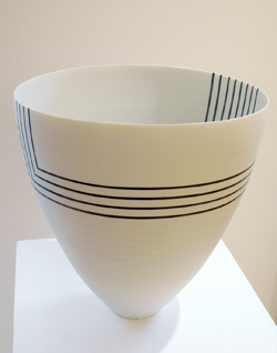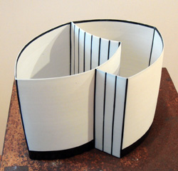 Nicht genug damit. Sie gestaltet die Außen- und Innenwände ihrer Objekte in flächiger oder geometrischer Form, so dass im Umgang um das Gefäß sich der Betrachterin stets neue Bilder in vielerlei Dimensionen ergeben. Die symbolische Kraft solcherlei Objekte sei hier nur angedeutet: Gefäße, die sich in ihrer Begegnung öffnen, sich überschneiden, ein gemeinsames bilden und je Eigenes für sich beinhalten.