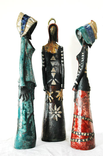 The works of the ceramic artists from Greece exemplifies heterogeneity and richness of contemporary Greek ceramic art. From Kostas Karakitsos women statues will be shown. It is the posture, the silence and calmness that emerges from the upright figures that makes these works so intensive. Karakitsos does not work the facial details out. He is focusing on the posture that conceals and at the same time unveils character and mood expressed in the individual personification. The hands of the figures are large in order to hold a valuable idea such as, a bird to fly free, a soul protector, a house for a family, etc. Their long dresses are decorated with flowers and ornaments and the figures often wear a ladies hood. Looking at them standing in groups, the spectator almost hears their dialogues and their inner as well their outer correspondence. One is gently carried into the narrative, the associative and transcendent message enshrined within each of the figures. “Contemporary art”, is, for him, “an oasis against the ceaseless leveling of our horizons. It is the ray of light that shines on our dark path, assuming with amazing dexterity the role of the leader. Man created art, but art humanized man. It is the perpetual power springing from our unconscious ego which pushes us to understand and comprehend our existence.”